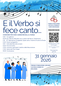 appuntamenti Ufficio Liturgico, Musica Sacra 12 Gennaio 2026 E li Verbo si fece canto… sabato 31 Gennaio Descrizione: Convegno per cori e animatori della liturgia Iscrizione qui Inizio: 31/01/2026 09:30 Fine: 31/01/2026 18:00 Categorie: appuntamenti Ufficio Liturgico, Musica Sacra Allegati: Volantino - E il verbo si fece canto Indirizzo: Via Riva di Reno 77 Città: Bologna Regione: Emilia-Romagna Paese: Italia E li Verbo si fece canto...Via Riva di Reno 57, 40122 Bologna, Emilia-Romagna Italia condividi su